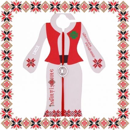 Martisor ambalat pe suport de carton de culoare bej in forma de costum popular romanesc cu motive traditionale si mesajul Daruieste primavara.