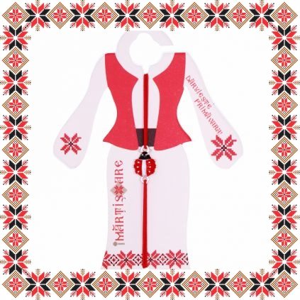 Martisor ambalat pe suport de carton de culoare bej in forma de costum popular romanesc cu motive traditionale si mesajul Daruieste primavara. Snur de martisor si plic de hartie imprimat cu motive traditionale romanesti CADOU!