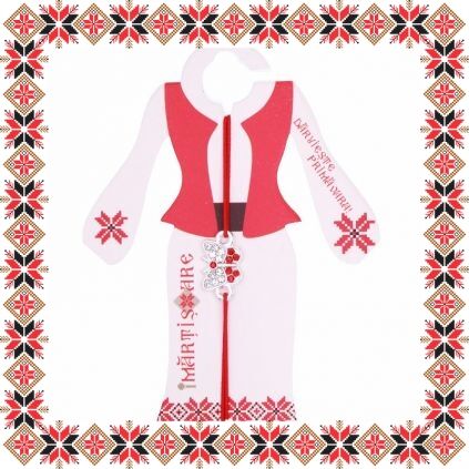 Martisor ambalat pe suport de carton de culoare bej in forma de costum popular romanesc cu motive traditionale si mesajul Daruieste primavara.