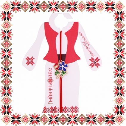 Martisor ambalat pe suport de carton de culoare bej in forma de costum popular romanesc cu motive traditionale si mesajul Daruieste primavara. Snur de martisor si plic de hartie imprimat cu motive traditionale romanesti CADOU!
