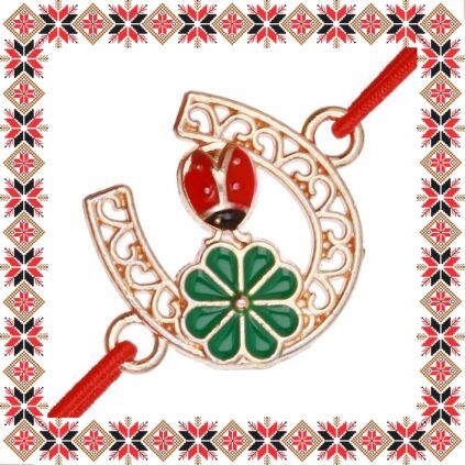 Martisor tip bratara cu pandantiv in forma de potcoava filigranata cu trifoi si gargarita, realizat din email rosu, negru si verde pe baza metalica aurie si elastic de culoare rosie. Daruieste martisoare cu semnificatie odata cu venirea primaverii!