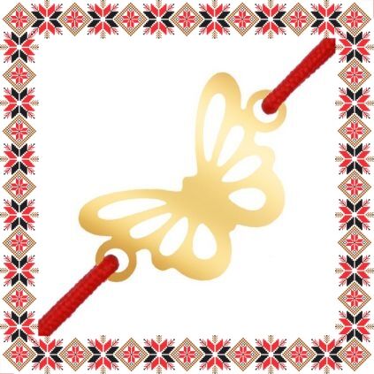 Martisor tip bratara cu pandantiv in forma unui fluture contur, realizata din otel inoxidabil de culoare aurie si elastic de culoare rosie. Pandantivul este realizat din otel inoxidabil, un material rezistent ce nu isi modifica culoarea si aspectul in timp iar elasticul este de culoare rosie. Dimensiunea bratarii se poate regla prin cele doua noduri culisante, fiind potrivita pentru diferite circumferinte ale mainii.