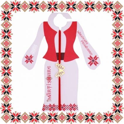 Martisor ambalat pe suport de carton de culoare bej in forma de costum popular romanesc cu motive traditionale si mesajul Daruieste primavara.