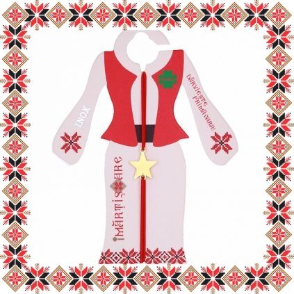 Martisor ambalat pe suport de carton de culoare bej in forma de costum popular romanesc cu motive traditionale si mesajul Daruieste primavara.