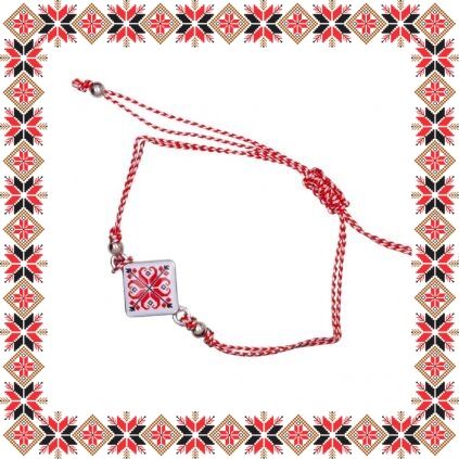 Martisor tip bratara cu pandantiv patrat cu motive traditionale romanesti in nuante de rosu si negru pe baza metalica argintie. Bratara are snur rosu cu alb si margelute metalice. Daruieste martisoare traditionale odata cu venirea primaverii!
