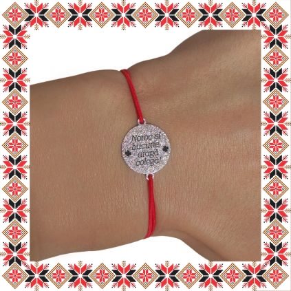 Bratara martisor cu pandantiv realizat din inox argintiu in forma de banut norocos, cu efect praf de stele stralucitor pe o parte si oglinda pe verso. Personalizata prin gravura cu trifoiasi norocosi si mesajul Noroc si bucurie, draga colega! Dimensiunea bratarii se poate regla prin cele doua noduri culisante, fiind potrivita pentru diferite circumferinte ale mainii. Gravam cu bucurie martisoare cu personalitate, special create pentru oamenii dragi din viata ta!