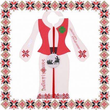 Martisoare ambalate pe suport de carton de culoare bej in forma de costum popular romanesc cu motive traditionale. Snur de martisor si plic de hartie imprimat cu motive traditionale romanesti CADOU!