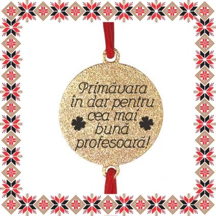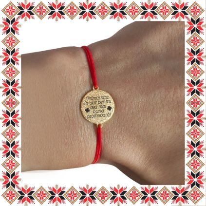 Bratara martisor cu pandantiv realizat din inox auriu in forma de banut norocos, cu efect praf de stele stralucitor pe o parte si oglinda pe verso. Personalizata prin gravura cu trifoiasi norocosi si mesajul Primavara in dar pentru cea mai buna profesoara. Dimensiunea bratarii se poate regla prin cele doua noduri culisante, fiind potrivita pentru diferite circumferinte ale mainii. Gravam cu bucurie martisoare cu personalitate, special create pentru oamenii dragi din viata ta!