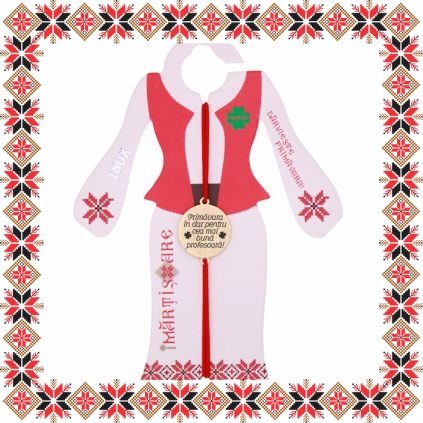 Martisoare ambalate pe suport de carton de culoare bej in forma de costum popular romanesc cu motive traditionale. Snur de martisor si plic de hartie imprimat cu motive traditionale romanesti CADOU!