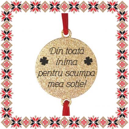 Bratara martisor cu pandantiv realizat din inox auriu in forma de banut norocos, cu efect praf de stele stralucitor pe o parte si oglinda pe verso. Personalizata prin gravura cu trifoiasi norocosi si mesajul Din toata inima pentru scumpa mea sotie! Dimensiunea bratarii se poate regla prin cele doua noduri culisante, fiind potrivita pentru diferite circumferinte ale mainii. Gravam cu bucurie martisoare cu personalitate, special create pentru oamenii dragi din viata ta!