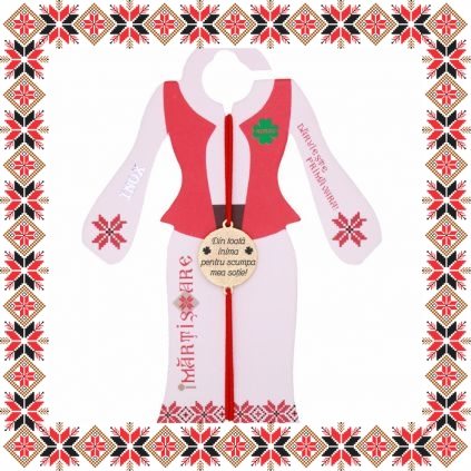 Martisoare ambalate pe suport de carton de culoare bej in forma de costum popular romanesc cu motive traditionale. Snur de martisor si plic de hartie imprimat cu motive traditionale romanesti CADOU!