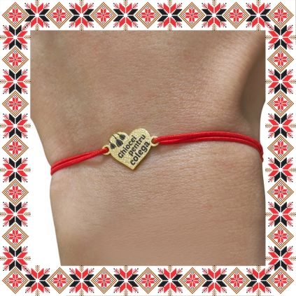 Bratara martisor cu pandantiv realizat din inox auriu in forma de inima, cu efect praf de stele stralucitor pe o parte si oglinda pe verso. Personalizata prin gravura cu ghiocei si mesajul Ghiocei pentru colega. Dimensiunea bratarii se poate regla prin cele doua noduri culisante, fiind potrivita pentru diferite circumferinte ale mainii. Gravam cu bucurie martisoare cu personalitate, special create pentru oamenii dragi din viata ta!