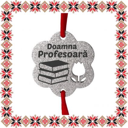 Bratara martisor cu pandantiv realizat din inox argintiu in forma de floare cu perforatie lalea. Personalizat prin gravura cu teanc de carti si mesajul Doamna Profesoara. Pandantiv praf de stele cu efect stralucitor pe o parte si efect oglinda pe cealalta parte. Dimensiunea bratarii se poate regla prin cele doua noduri culisante, fiind potrivita pentru diferite circumferinte ale mainii. Gravam cu bucurie martisoare cu personalitate, special create pentru oamenii dragi din viata ta!