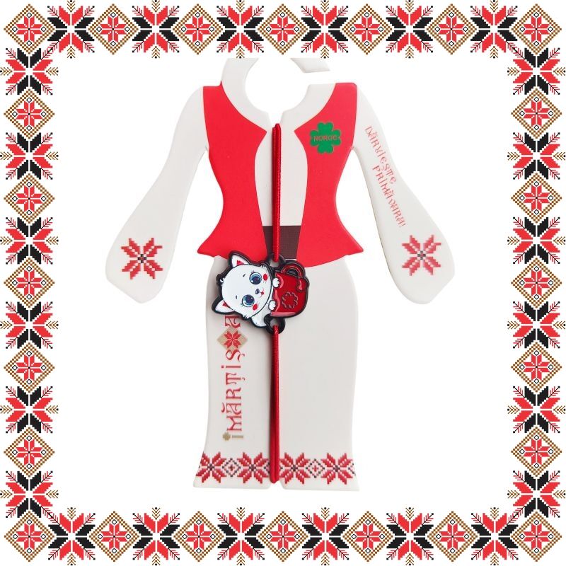 Martisor ambalat pe suport de carton de culoare bej in forma de costum popular, cu tematica inspirata din folclor si stil prietenos, design traditional, stil modern. Snur de martisor si plic de hartie imprimat cu motive traditionale romanesti CADOU!