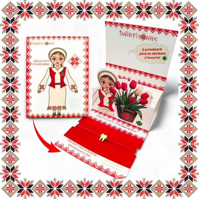 Martisor ambalat premium pe suport de carton tip felicitare 3D de culoare bej cu catifea rosie, tematica inspirata din folclor si stil prietenos, design traditional, stil modern.