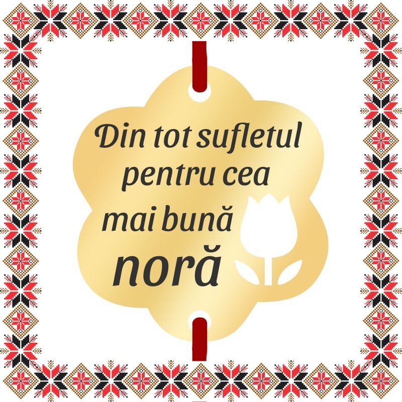 Martisor bratara cu pandantiv in forma de floare cu perforatie lalea. Realizat din inox acoperit PVD cu aur si personalizat prin gravura laser cu mesajul Din tot sufletul pentru cea mai buna nora! Daruieste martisoare deosebite, personalizate special pentru oamenii pe care ii iubesti, pe care ii admiri, celor carora vrei sa le multumesti si celor carora vrei sa le daruiesti un gand bun odata cu venirea primaverii! Opteaza pentru un martisor realizat din otel inoxidabil pentru ca primitoarea sa il poata purta tot anul.