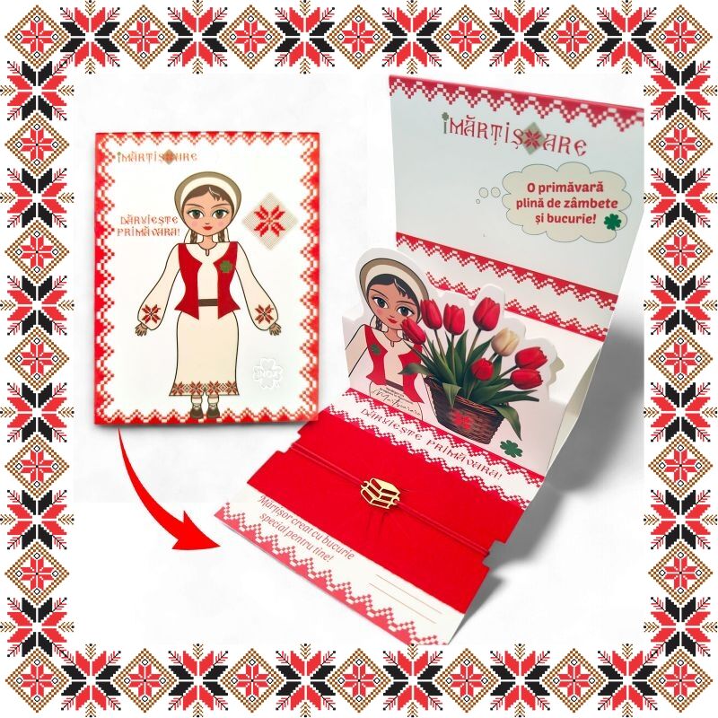 Martisor ambalat premium pe suport de carton tip felicitare 3D de culoare bej cu catifea rosie, tematica inspirata din folclor si stil prietenos, design traditional, stil modern. Snur de martisor si plic de hartie imprimat cu motive traditionale romanesti CADOU!