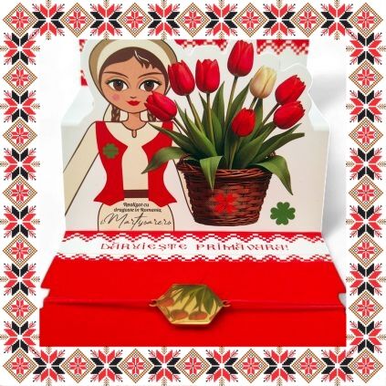 Martisor ambalat premium pe suport de carton tip felicitare 3D de culoare bej cu catifea rosie, tematica inspirata din folclor si stil prietenos, design traditional, stil modern.