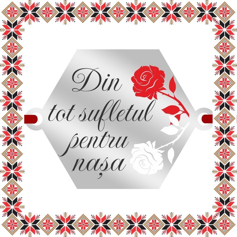 Martisor bratara cu pandantiv in forma hexagonala cu trandafiri alb rosu. Realizat din inox argintiu, email rosu si alb si personalizat prin gravura laser cu mesajul Din tot sufletul pentru nasa. Daruieste martisoare deosebite, personalizate special pentru oamenii pe care ii iubesti, pe care ii admiri, celor carora vrei sa le multumesti si celor carora vrei sa le daruiesti un gand bun odata cu venirea primaverii! Opteaza pentru un martisor realizat din otel inoxidabil pentru ca primitoarea sa il poata purta tot anul.