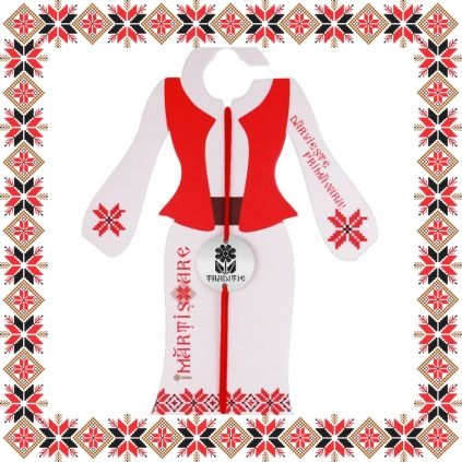 Martisor ambalat pe suport de carton de culoare bej in forma de costum popular romanesc cu motive traditionale. Plic de hartie imprimat cu motive traditionale romanesti CADOU!