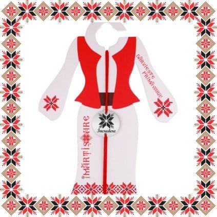 Martisor ambalat pe suport de carton de culoare bej in forma de costum popular romanesc cu motive traditionale. Plic de hartie imprimat cu motive traditionale romanesti CADOU!