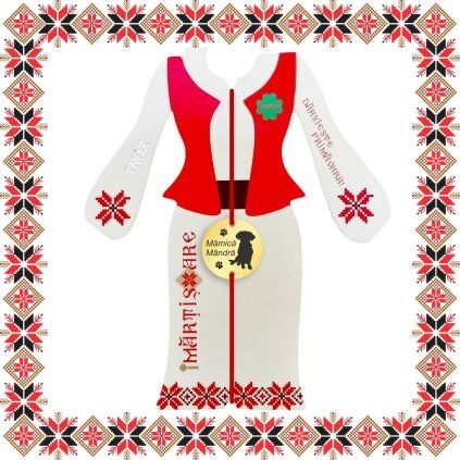 Martisor ambalat pe suport de carton de culoare bej in forma de costum popular romanesc cu motive traditionale. Plic de hartie imprimat cu motive traditionale romanesti CADOU!