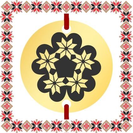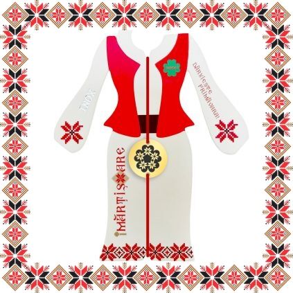 Martisor ambalat pe suport de carton de culoare bej in forma de costum popular romanesc cu motive traditionale. Plic de hartie imprimat cu motive traditionale romanesti CADOU!