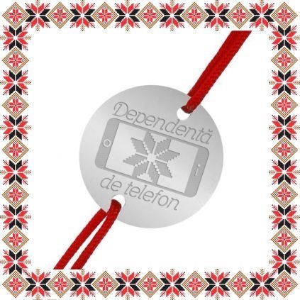 Bratara martisor cu pandantiv in forma de banut de culoare argintie realizata din otel inoxidabil si snur din material textil de culoare rosie. Martisor gravat cu motive traditionale, telefon si mesajul Dependenta de telefon.  Otelul inoxidabil cunoscut si ca inox este un material mai dur decat argintul ceea ce il face mai rezistent in timp. Ofera un martisor discret ce se preteaza a fi purtat to anul!