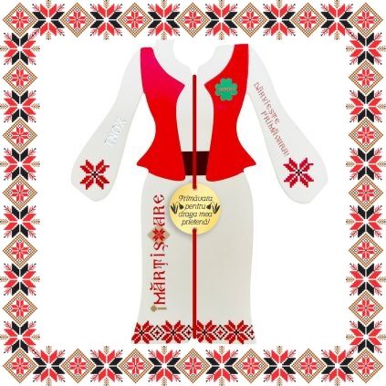 Martisor ambalat pe suport de carton de culoare bej in forma de costum popular romanesc cu motive traditionale. Plic de hartie imprimat cu motive traditionale romanesti CADOU!