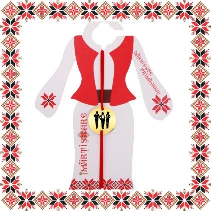Martisor ambalat pe suport de carton de culoare bej in forma de costum popular romanesc cu motive traditionale. Plic de hartie imprimat cu motive traditionale romanesti CADOU!
