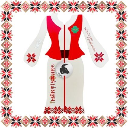 Martisor ambalat pe suport de carton de culoare bej in forma de costum popular romanesc cu motive traditionale. Plic de hartie imprimat cu motive traditionale romanesti CADOU!