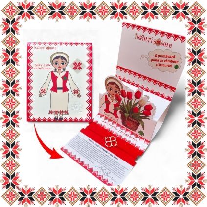 Martisor ambalat premium pe suport de carton tip felicitare 3D de culoare bej cu catifea rosie, tematica inspirata din folclor si stil prietenos, design traditional reinterpretat modern. Snur de martisor si plic de hartie imprimat cu motive traditionale romanesti CADOU!