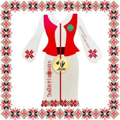 Martisor ambalat pe suport de carton de culoare bej in forma de costum popular romanesc cu motive traditionale. Plic de hartie imprimat cu motive traditionale romanesti CADOU!