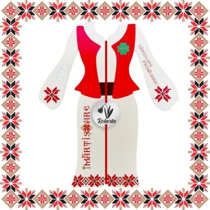 Martisor ambalat pe suport de carton de culoare bej in forma de costum popular romanesc cu motive traditionale. Plic de hartie imprimat cu motive traditionale romanesti CADOU!