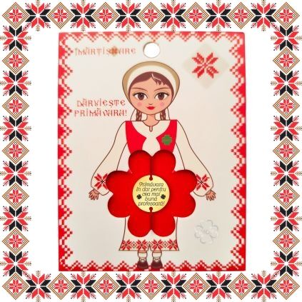 Martisor ambalat pe suport de carton cu catifea rosie si plic de carton cu motive traditionale.