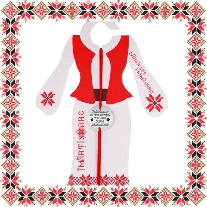 Martisor ambalat pe suport de carton de culoare bej in forma de costum popular romanesc cu motive traditionale. Plic de hartie imprimat cu motive traditionale romanesti CADOU!