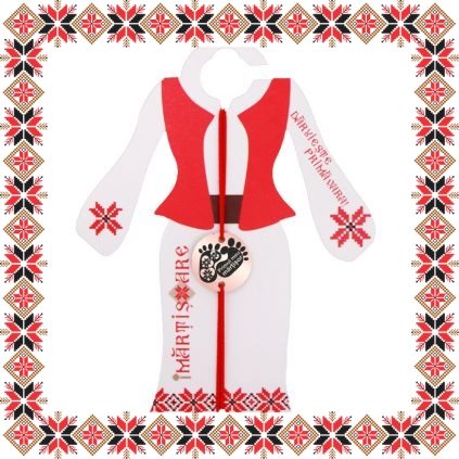 Martisor ambalat pe suport de carton de culoare bej in forma de costum popular romanesc cu motive traditionale. Plic de hartie imprimat cu motive traditionale romanesti CADOU!