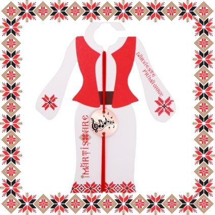 Martisor ambalat pe suport de carton de culoare bej in forma de costum popular romanesc cu motive traditionale. Plic de hartie imprimat cu motive traditionale romanesti CADOU!