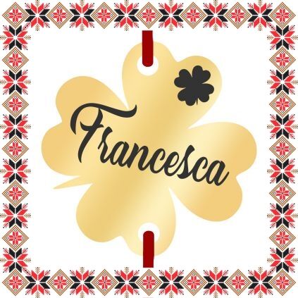 Bratara martisor cu pandantiv in forma de trifoi cu patru foi de culoare aurie gravat cu trifoi si numele ei, Francesca. Ofera un martisor norocos ce se preteaza a fi purtat to anul! Daruieste martisoare personalizate!