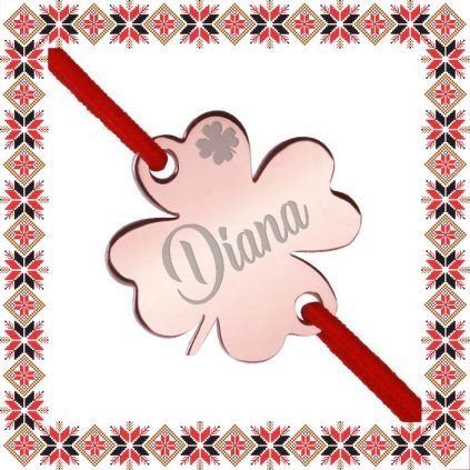 Bratara martisor cu pandantiv din inox in forma de trifoi cu patru foi de culoare rose gold gravat cu trifoi si numele ei, Diana. Ofera un martisor norocos ce se preteaza a fi purtat to anul! Daruieste martisoare personalizate!