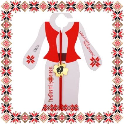 Martisor ambalat pe suport de carton de culoare bej in forma de costum popular romanesc cu motive traditionale. Plic de hartie imprimat cu motive traditionale romanesti CADOU!