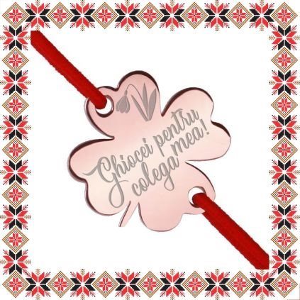 Bratara martisor cu pandantiv din inox in forma de trifoi cu patru foi de culoare rose gold gravat cu ghiocel si mesajul Ghiocei pentru colega mea! Daruieste martisoare personalizate!