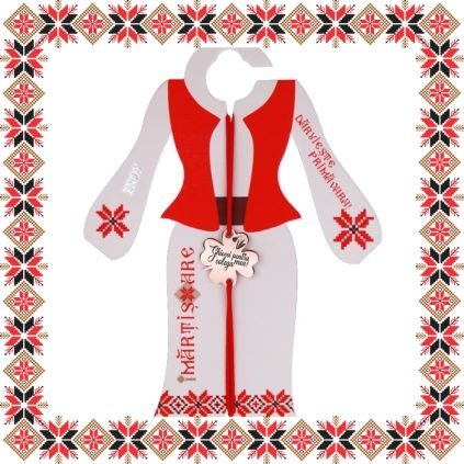 Martisor ambalat pe suport de carton de culoare bej in forma de costum popular romanesc cu motive traditionale. Plic de hartie imprimat cu motive traditionale romanesti CADOU!