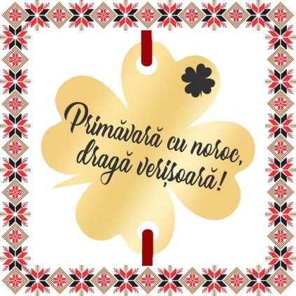 Bratara martisor cu pandantiv din inox in forma de trifoi cu patru foi de culoare aurie gravat cu ghiocel si mesajul Primavara cu noroc, draga verisoara! Otelul inoxidabil cunoscut si ca inox este un material foarte rezistent ce nu oxideaza, ceea ce a dus la utilizarea din ce in ce mai frecventa de catre bijutieri in creatiile lor. Ofera un martisor norocos ce se preteaza a fi purtat to anul! Daruieste martisoare cu semnificatie!