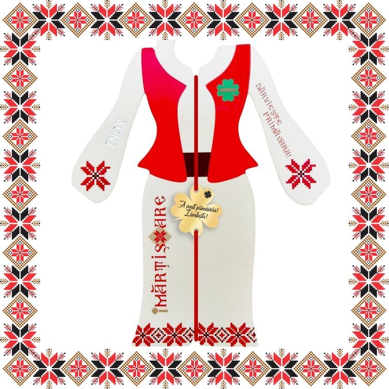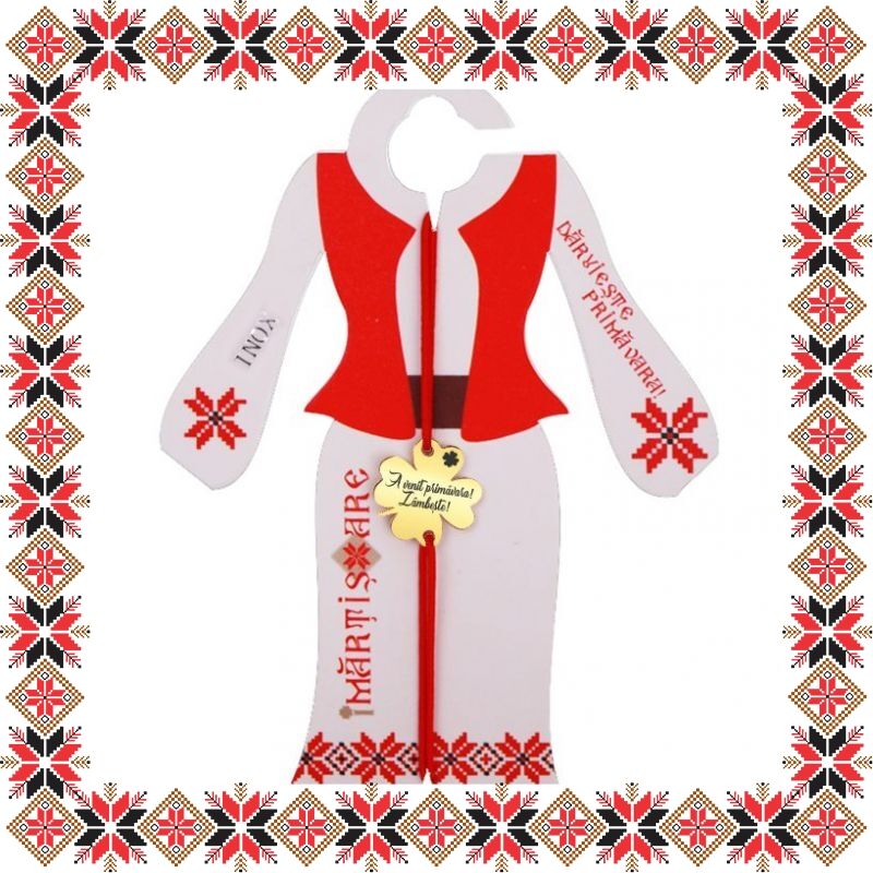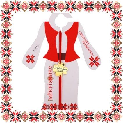 Martisor ambalat pe suport de carton de culoare bej in forma de costum popular romanesc cu motive traditionale. Plic de hartie imprimat cu motive traditionale romanesti CADOU!