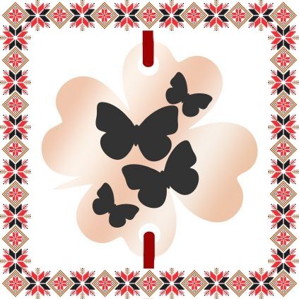 Martisor ambalat pe suport de carton de culoare bej in forma de costum popular romanesc cu motive traditionale. Plic de hartie imprimat cu motive traditionale romanesti CADOU!