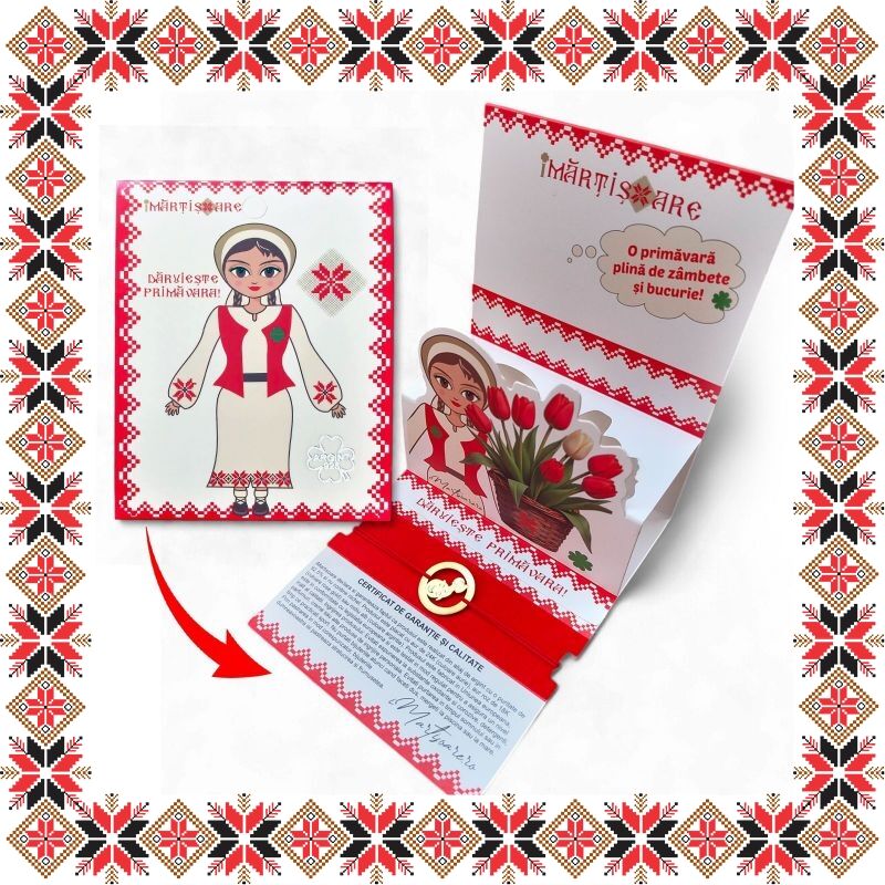 Martisor ambalat premium pe suport de carton tip felicitare 3D de culoare bej cu catifea rosie, tematica inspirata din folclor si stil prietenos, design traditional reinterpretat modern. Snur de martisor si plic de hartie imprimat cu motive traditionale romanesti CADOU!