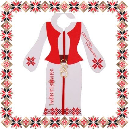 Martisor ambalat pe suport de carton de culoare bej in forma de costum popular romanesc cu motive traditionale.