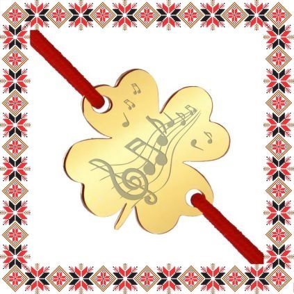 Bratara martisor cu pandantiv din inox in forma de trifoi de culoare aurie gravat cu portativ cu cheia sol si note muzicale. Daruieste muzica de martisor!