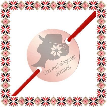 Bratara martisor cu pandantiv in forma de banut de culoare rose gold realizata din otel inoxidabil si snur din material textil de culoare rosie. Bratara gravata cu silueta unei doamne elegante cu palarie cu floare motive traditionale si inscriptia Cea mai eleganta doamna. Martisorul ideal pentru doamnele mereu aranjate, mereu elegante si gratioase. Potrivit si pentru doamna profesoara, doamna educatoare, doamna invatatoare sau doamna doctor. Otelul inoxidabil cunoscut si ca inox este un material mai dur decat argintul ceea ce il face mai rezistent in timp. Ofera un martisor discret ce se preteaza a fi purtat to anul!